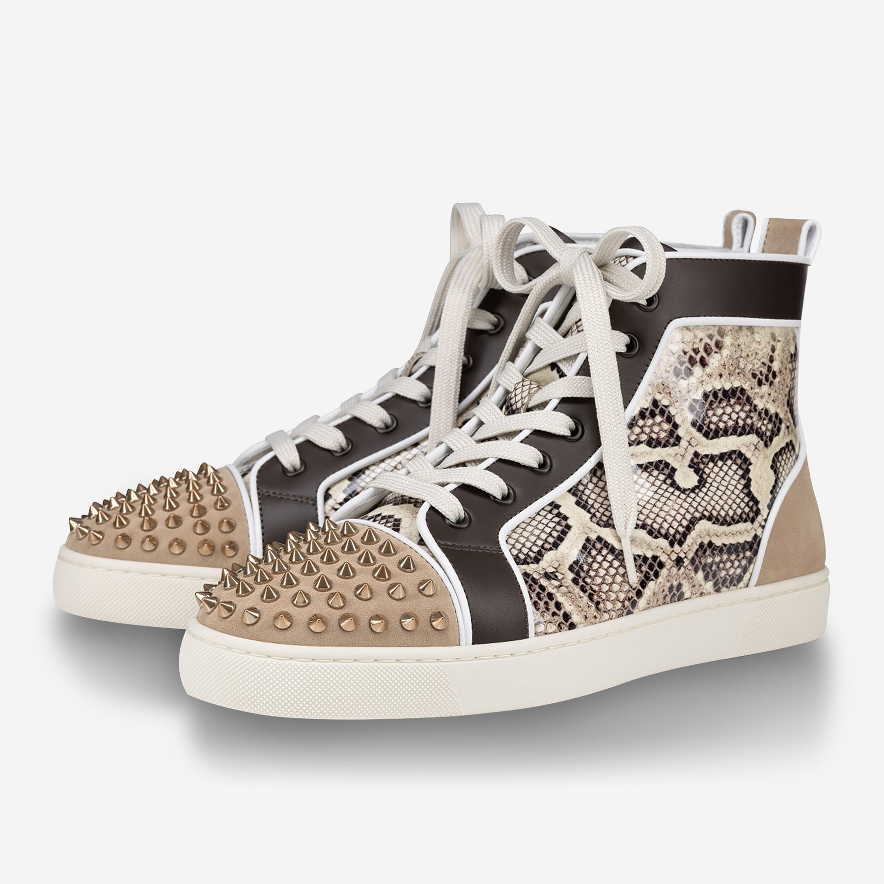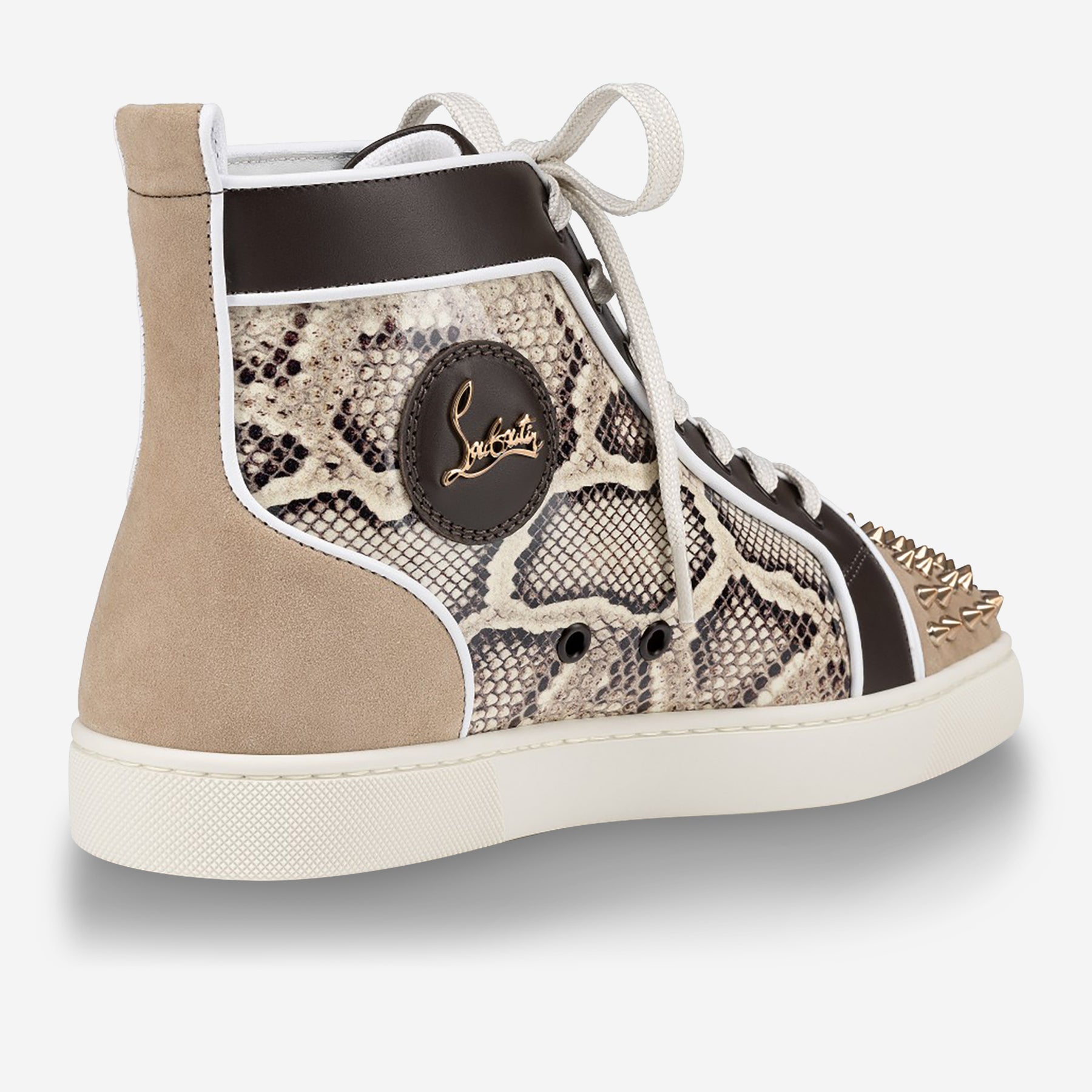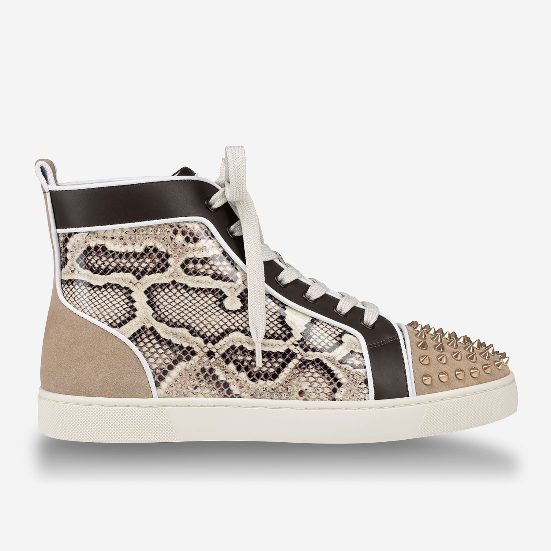• It features a white sole and is crafted in Prahina snake effect patent leather