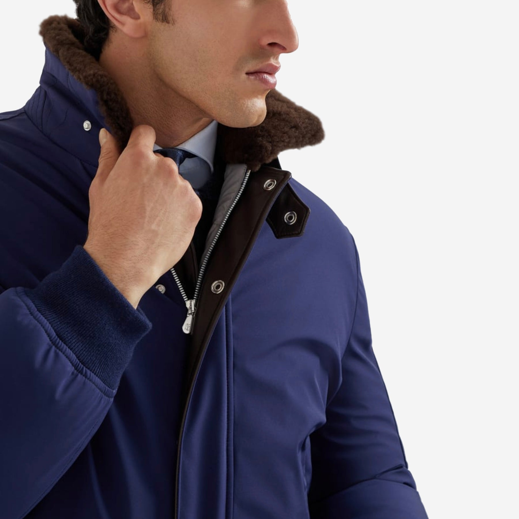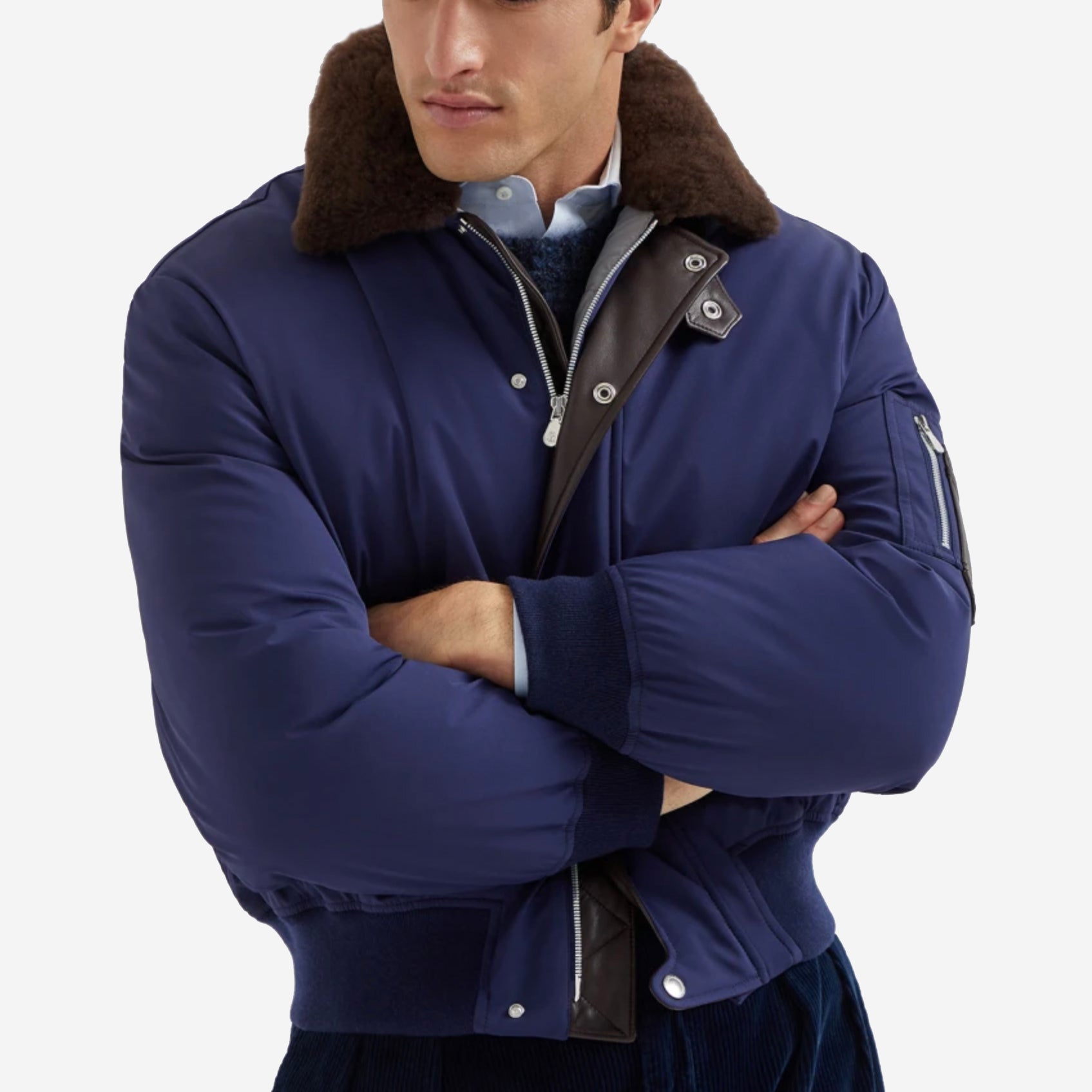 Brunello Cucinelli Stretch Bonded Nylon Down Shearling-Lined Collar Jacket