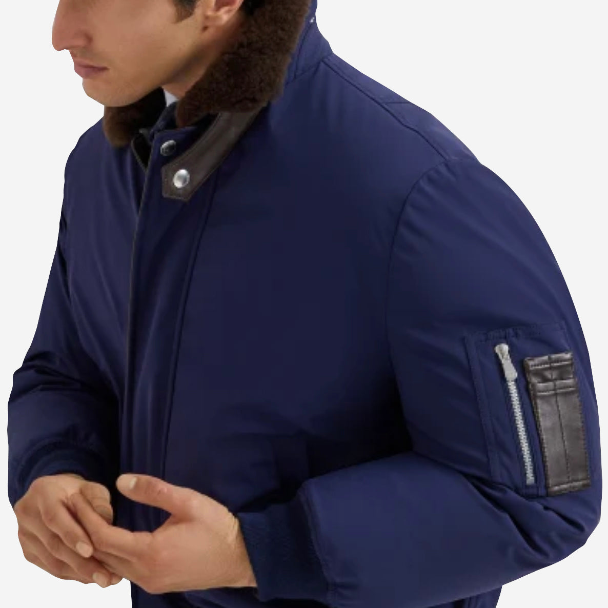 Characterized by a smooth, fluid texture, in delicate contrast with the shearling collar