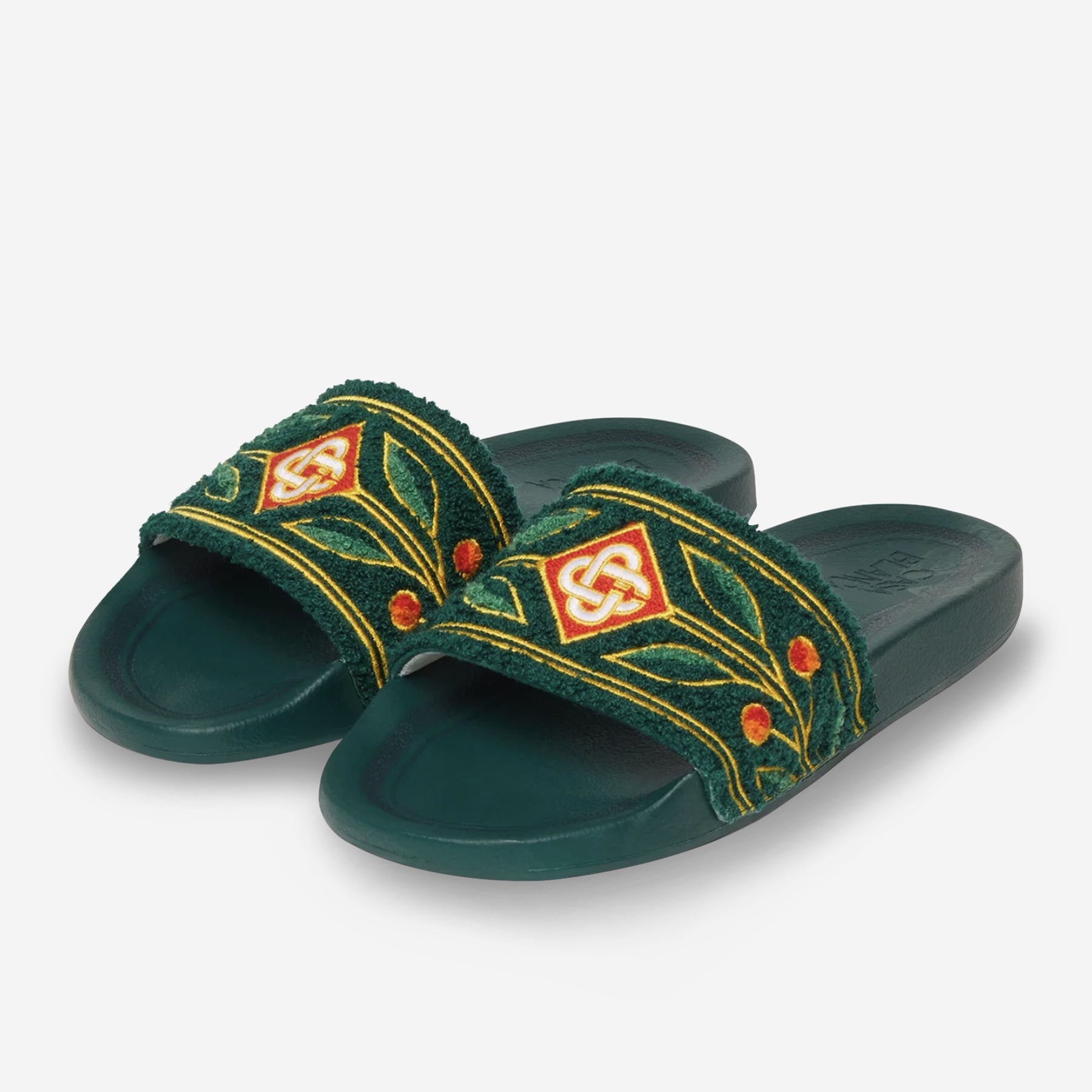 - The pool slides are crafted from an embroidered terry fabric and feature the house's diamond logo and signature Laurel artwork on its uppers