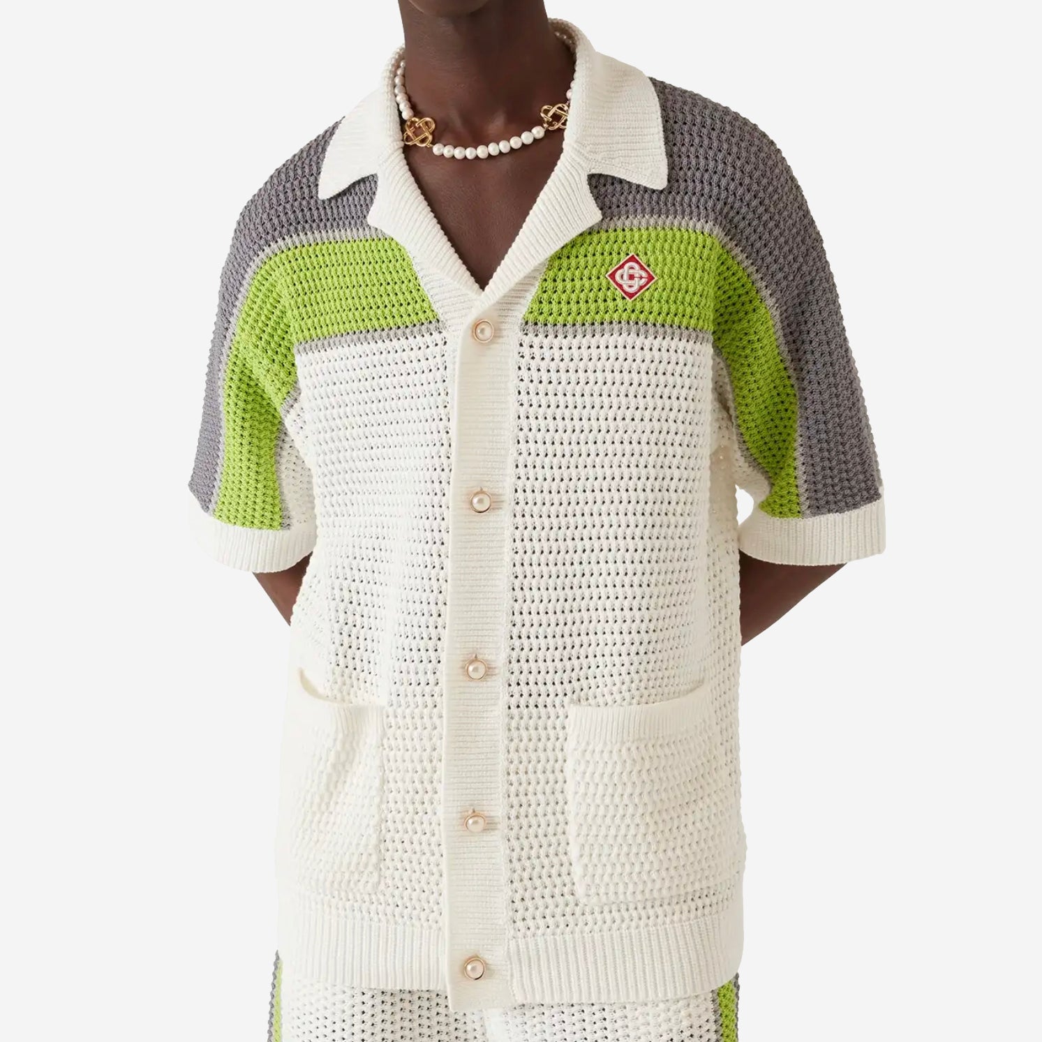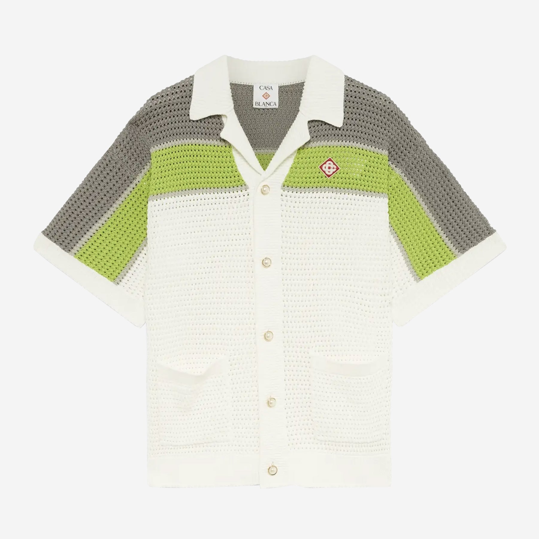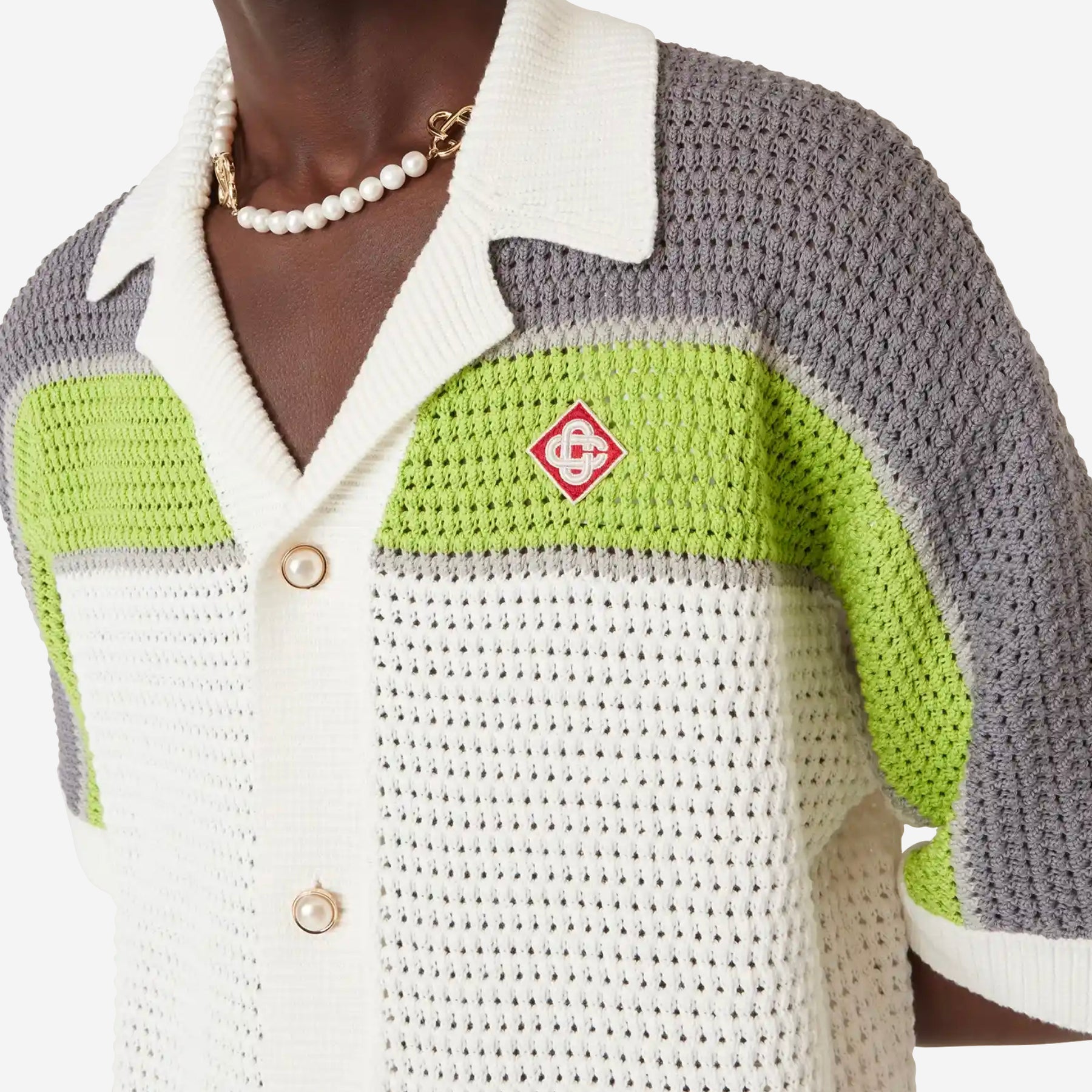 • The stripe crochet shirt is a refined classic design featuring the house's warped logo and stripe detail across the shoulders, chest and sleeves, in natural colours