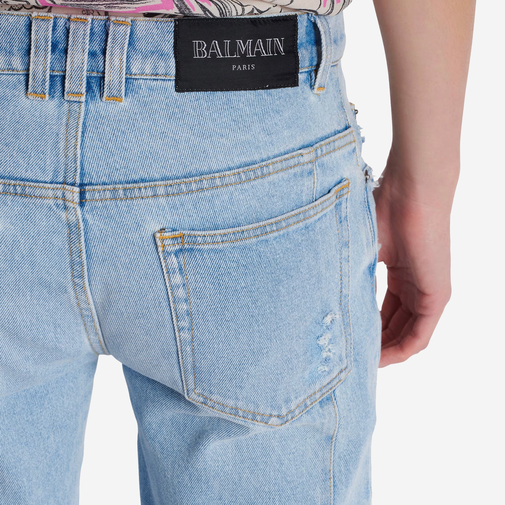 • Waistband with belt loops and a triple belt loop at the back