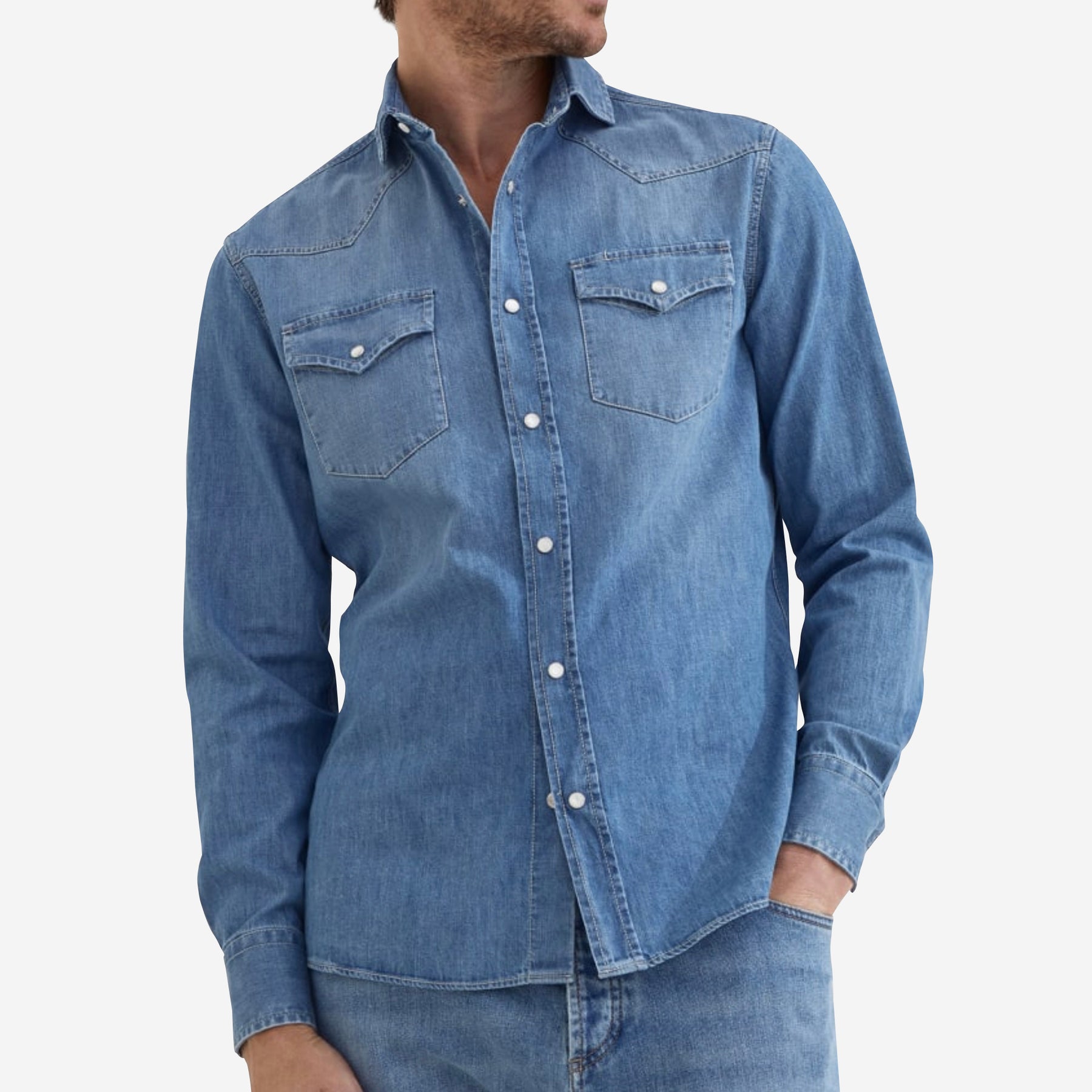• The sporty feel of lightweight denim enriches this western-inspired shirt